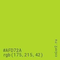 Цвет #AFD72A в цветовой модели RGB обозначается тремя октетами (175, 215, 42) в десятичном формате и #AFD72A в шестнадцатиричном (hex) формате, которые являются интенсивностью красного 175 (hex AF), интенсивность зелёного 215 (hex D7) и интенсивность синего 42 (hex 2A).