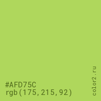 Цвет #AFD75C в цветовой модели RGB обозначается тремя октетами (175, 215, 92) в десятичном формате и #AFD75C в шестнадцатиричном (hex) формате, которые являются интенсивностью красного 175 (hex AF), интенсивность зелёного 215 (hex D7) и интенсивность синего 92 (hex 5C).