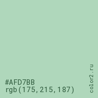 Цвет #AFD7BB в цветовой модели RGB обозначается тремя октетами (175, 215, 187) в десятичном формате и #AFD7BB в шестнадцатиричном (hex) формате, которые являются интенсивностью красного 175 (hex AF), интенсивность зелёного 215 (hex D7) и интенсивность синего 187 (hex BB).
