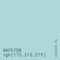 Цвет #AFD7DB в цветовой модели RGB обозначается тремя октетами (175, 215, 219) в десятичном формате и #AFD7DB в шестнадцатиричном (hex) формате, которые являются интенсивностью красного 175 (hex AF), интенсивность зелёного 215 (hex D7) и интенсивность синего 219 (hex DB).