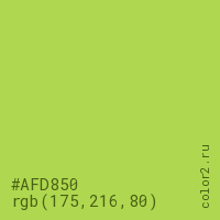Цвет #AFD850 в цветовой модели RGB обозначается тремя октетами (175, 216, 80) в десятичном формате и #AFD850 в шестнадцатиричном (hex) формате, которые являются интенсивностью красного 175 (hex AF), интенсивность зелёного 216 (hex D8) и интенсивность синего 80 (hex 50).