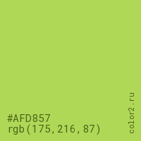 Цвет #AFD857 в цветовой модели RGB обозначается тремя октетами (175, 216, 87) в десятичном формате и #AFD857 в шестнадцатиричном (hex) формате, которые являются интенсивностью красного 175 (hex AF), интенсивность зелёного 216 (hex D8) и интенсивность синего 87 (hex 57).