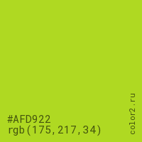 Цвет #AFD922 в цветовой модели RGB обозначается тремя октетами (175, 217, 34) в десятичном формате и #AFD922 в шестнадцатиричном (hex) формате, которые являются интенсивностью красного 175 (hex AF), интенсивность зелёного 217 (hex D9) и интенсивность синего 34 (hex 22).