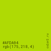 Цвет #AFDA04 в цветовой модели RGB обозначается тремя октетами (175, 218, 4) в десятичном формате и #AFDA04 в шестнадцатиричном (hex) формате, которые являются интенсивностью красного 175 (hex AF), интенсивность зелёного 218 (hex DA) и интенсивность синего 4 (hex 04).
