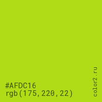 Цвет #AFDC16 в цветовой модели RGB обозначается тремя октетами (175, 220, 22) в десятичном формате и #AFDC16 в шестнадцатиричном (hex) формате, которые являются интенсивностью красного 175 (hex AF), интенсивность зелёного 220 (hex DC) и интенсивность синего 22 (hex 16).