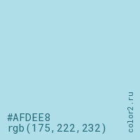 Цвет #AFDEE8 в цветовой модели RGB обозначается тремя октетами (175, 222, 232) в десятичном формате и #AFDEE8 в шестнадцатиричном (hex) формате, которые являются интенсивностью красного 175 (hex AF), интенсивность зелёного 222 (hex DE) и интенсивность синего 232 (hex E8).
