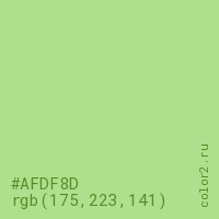 Цвет #AFDF8D в цветовой модели RGB обозначается тремя октетами (175, 223, 141) в десятичном формате и #AFDF8D в шестнадцатиричном (hex) формате, которые являются интенсивностью красного 175 (hex AF), интенсивность зелёного 223 (hex DF) и интенсивность синего 141 (hex 8D).