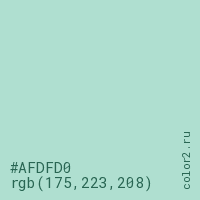 Цвет #AFDFD0 в цветовой модели RGB обозначается тремя октетами (175, 223, 208) в десятичном формате и #AFDFD0 в шестнадцатиричном (hex) формате, которые являются интенсивностью красного 175 (hex AF), интенсивность зелёного 223 (hex DF) и интенсивность синего 208 (hex D0).