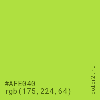 Цвет #AFE040 в цветовой модели RGB обозначается тремя октетами (175, 224, 64) в десятичном формате и #AFE040 в шестнадцатиричном (hex) формате, которые являются интенсивностью красного 175 (hex AF), интенсивность зелёного 224 (hex E0) и интенсивность синего 64 (hex 40).