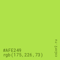Цвет #AFE249 в цветовой модели RGB обозначается тремя октетами (175, 226, 73) в десятичном формате и #AFE249 в шестнадцатиричном (hex) формате, которые являются интенсивностью красного 175 (hex AF), интенсивность зелёного 226 (hex E2) и интенсивность синего 73 (hex 49).