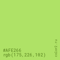 Цвет #AFE266 в цветовой модели RGB обозначается тремя октетами (175, 226, 102) в десятичном формате и #AFE266 в шестнадцатиричном (hex) формате, которые являются интенсивностью красного 175 (hex AF), интенсивность зелёного 226 (hex E2) и интенсивность синего 102 (hex 66).