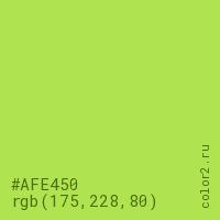 Цвет #AFE450 в цветовой модели RGB обозначается тремя октетами (175, 228, 80) в десятичном формате и #AFE450 в шестнадцатиричном (hex) формате, которые являются интенсивностью красного 175 (hex AF), интенсивность зелёного 228 (hex E4) и интенсивность синего 80 (hex 50).