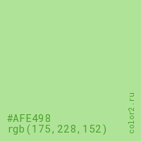 Цвет #AFE498 в цветовой модели RGB обозначается тремя октетами (175, 228, 152) в десятичном формате и #AFE498 в шестнадцатиричном (hex) формате, которые являются интенсивностью красного 175 (hex AF), интенсивность зелёного 228 (hex E4) и интенсивность синего 152 (hex 98).