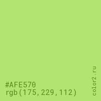 Цвет #AFE570 в цветовой модели RGB обозначается тремя октетами (175, 229, 112) в десятичном формате и #AFE570 в шестнадцатиричном (hex) формате, которые являются интенсивностью красного 175 (hex AF), интенсивность зелёного 229 (hex E5) и интенсивность синего 112 (hex 70).
