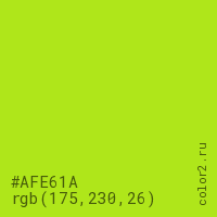 Цвет #AFE61A в цветовой модели RGB обозначается тремя октетами (175, 230, 26) в десятичном формате и #AFE61A в шестнадцатиричном (hex) формате, которые являются интенсивностью красного 175 (hex AF), интенсивность зелёного 230 (hex E6) и интенсивность синего 26 (hex 1A).