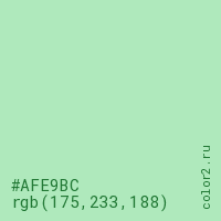 Цвет #AFE9BC в цветовой модели RGB обозначается тремя октетами (175, 233, 188) в десятичном формате и #AFE9BC в шестнадцатиричном (hex) формате, которые являются интенсивностью красного 175 (hex AF), интенсивность зелёного 233 (hex E9) и интенсивность синего 188 (hex BC).