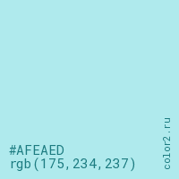 Цвет #AFEAED в цветовой модели RGB обозначается тремя октетами (175, 234, 237) в десятичном формате и #AFEAED в шестнадцатиричном (hex) формате, которые являются интенсивностью красного 175 (hex AF), интенсивность зелёного 234 (hex EA) и интенсивность синего 237 (hex ED).