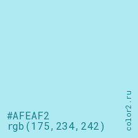 Цвет #AFEAF2 в цветовой модели RGB обозначается тремя октетами (175, 234, 242) в десятичном формате и #AFEAF2 в шестнадцатиричном (hex) формате, которые являются интенсивностью красного 175 (hex AF), интенсивность зелёного 234 (hex EA) и интенсивность синего 242 (hex F2).