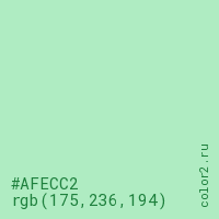 Цвет #AFECC2 в цветовой модели RGB обозначается тремя октетами (175, 236, 194) в десятичном формате и #AFECC2 в шестнадцатиричном (hex) формате, которые являются интенсивностью красного 175 (hex AF), интенсивность зелёного 236 (hex EC) и интенсивность синего 194 (hex C2).