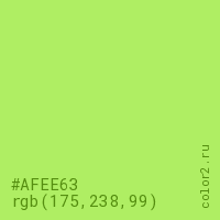 Цвет #AFEE63 в цветовой модели RGB обозначается тремя октетами (175, 238, 99) в десятичном формате и #AFEE63 в шестнадцатиричном (hex) формате, которые являются интенсивностью красного 175 (hex AF), интенсивность зелёного 238 (hex EE) и интенсивность синего 99 (hex 63).