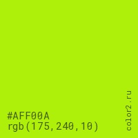 Цвет #AFF00A в цветовой модели RGB обозначается тремя октетами (175, 240, 10) в десятичном формате и #AFF00A в шестнадцатиричном (hex) формате, которые являются интенсивностью красного 175 (hex AF), интенсивность зелёного 240 (hex F0) и интенсивность синего 10 (hex 0A).