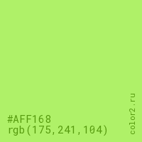 Цвет #AFF168 в цветовой модели RGB обозначается тремя октетами (175, 241, 104) в десятичном формате и #AFF168 в шестнадцатиричном (hex) формате, которые являются интенсивностью красного 175 (hex AF), интенсивность зелёного 241 (hex F1) и интенсивность синего 104 (hex 68).