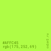 Цвет #AFFC45 в цветовой модели RGB обозначается тремя октетами (175, 252, 69) в десятичном формате и #AFFC45 в шестнадцатиричном (hex) формате, которые являются интенсивностью красного 175 (hex AF), интенсивность зелёного 252 (hex FC) и интенсивность синего 69 (hex 45).