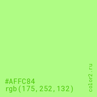 Цвет #AFFC84 в цветовой модели RGB обозначается тремя октетами (175, 252, 132) в десятичном формате и #AFFC84 в шестнадцатиричном (hex) формате, которые являются интенсивностью красного 175 (hex AF), интенсивность зелёного 252 (hex FC) и интенсивность синего 132 (hex 84).