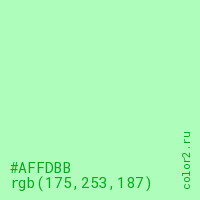 Цвет #AFFDBB в цветовой модели RGB обозначается тремя октетами (175, 253, 187) в десятичном формате и #AFFDBB в шестнадцатиричном (hex) формате, которые являются интенсивностью красного 175 (hex AF), интенсивность зелёного 253 (hex FD) и интенсивность синего 187 (hex BB).