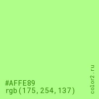 Цвет #AFFE89 в цветовой модели RGB обозначается тремя октетами (175, 254, 137) в десятичном формате и #AFFE89 в шестнадцатиричном (hex) формате, которые являются интенсивностью красного 175 (hex AF), интенсивность зелёного 254 (hex FE) и интенсивность синего 137 (hex 89).