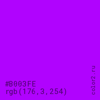 Цвет #B003FE в цветовой модели RGB обозначается тремя октетами (176, 3, 254) в десятичном формате и #B003FE в шестнадцатиричном (hex) формате, которые являются интенсивностью красного 176 (hex B0), интенсивность зелёного 3 (hex 03) и интенсивность синего 254 (hex FE).