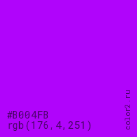 Цвет #B004FB в цветовой модели RGB обозначается тремя октетами (176, 4, 251) в десятичном формате и #B004FB в шестнадцатиричном (hex) формате, которые являются интенсивностью красного 176 (hex B0), интенсивность зелёного 4 (hex 04) и интенсивность синего 251 (hex FB).