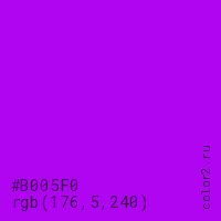 Цвет #B005F0 в цветовой модели RGB обозначается тремя октетами (176, 5, 240) в десятичном формате и #B005F0 в шестнадцатиричном (hex) формате, которые являются интенсивностью красного 176 (hex B0), интенсивность зелёного 5 (hex 05) и интенсивность синего 240 (hex F0).