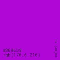 Цвет #B006D8 в цветовой модели RGB обозначается тремя октетами (176, 6, 216) в десятичном формате и #B006D8 в шестнадцатиричном (hex) формате, которые являются интенсивностью красного 176 (hex B0), интенсивность зелёного 6 (hex 06) и интенсивность синего 216 (hex D8).