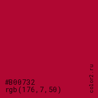 Цвет #B00732 в цветовой модели RGB обозначается тремя октетами (176, 7, 50) в десятичном формате и #B00732 в шестнадцатиричном (hex) формате, которые являются интенсивностью красного 176 (hex B0), интенсивность зелёного 7 (hex 07) и интенсивность синего 50 (hex 32).