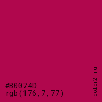 Цвет #B0074D в цветовой модели RGB обозначается тремя октетами (176, 7, 77) в десятичном формате и #B0074D в шестнадцатиричном (hex) формате, которые являются интенсивностью красного 176 (hex B0), интенсивность зелёного 7 (hex 07) и интенсивность синего 77 (hex 4D).