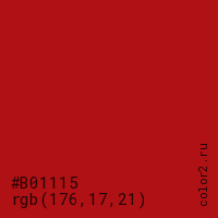 Цвет #B01115 в цветовой модели RGB обозначается тремя октетами (176, 17, 21) в десятичном формате и #B01115 в шестнадцатиричном (hex) формате, которые являются интенсивностью красного 176 (hex B0), интенсивность зелёного 17 (hex 11) и интенсивность синего 21 (hex 15).