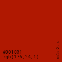 Цвет #B01801 в цветовой модели RGB обозначается тремя октетами (176, 24, 1) в десятичном формате и #B01801 в шестнадцатиричном (hex) формате, которые являются интенсивностью красного 176 (hex B0), интенсивность зелёного 24 (hex 18) и интенсивность синего 1 (hex 01).