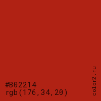 Цвет #B02214 в цветовой модели RGB обозначается тремя октетами (176, 34, 20) в десятичном формате и #B02214 в шестнадцатиричном (hex) формате, которые являются интенсивностью красного 176 (hex B0), интенсивность зелёного 34 (hex 22) и интенсивность синего 20 (hex 14).