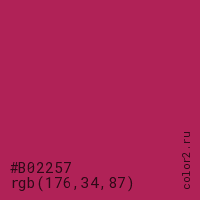 Цвет #B02257 в цветовой модели RGB обозначается тремя октетами (176, 34, 87) в десятичном формате и #B02257 в шестнадцатиричном (hex) формате, которые являются интенсивностью красного 176 (hex B0), интенсивность зелёного 34 (hex 22) и интенсивность синего 87 (hex 57).