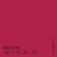 Цвет #B02449 в цветовой модели RGB обозначается тремя октетами (176, 36, 73) в десятичном формате и #B02449 в шестнадцатиричном (hex) формате, которые являются интенсивностью красного 176 (hex B0), интенсивность зелёного 36 (hex 24) и интенсивность синего 73 (hex 49).