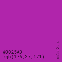 Цвет #B025AB в цветовой модели RGB обозначается тремя октетами (176, 37, 171) в десятичном формате и #B025AB в шестнадцатиричном (hex) формате, которые являются интенсивностью красного 176 (hex B0), интенсивность зелёного 37 (hex 25) и интенсивность синего 171 (hex AB).