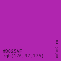 Цвет #B025AF в цветовой модели RGB обозначается тремя октетами (176, 37, 175) в десятичном формате и #B025AF в шестнадцатиричном (hex) формате, которые являются интенсивностью красного 176 (hex B0), интенсивность зелёного 37 (hex 25) и интенсивность синего 175 (hex AF).