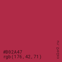 Цвет #B02A47 в цветовой модели RGB обозначается тремя октетами (176, 42, 71) в десятичном формате и #B02A47 в шестнадцатиричном (hex) формате, которые являются интенсивностью красного 176 (hex B0), интенсивность зелёного 42 (hex 2A) и интенсивность синего 71 (hex 47).