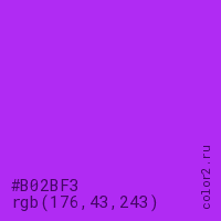 Цвет #B02BF3 в цветовой модели RGB обозначается тремя октетами (176, 43, 243) в десятичном формате и #B02BF3 в шестнадцатиричном (hex) формате, которые являются интенсивностью красного 176 (hex B0), интенсивность зелёного 43 (hex 2B) и интенсивность синего 243 (hex F3).