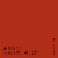 Цвет #B02E17 в цветовой модели RGB обозначается тремя октетами (176, 46, 23) в десятичном формате и #B02E17 в шестнадцатиричном (hex) формате, которые являются интенсивностью красного 176 (hex B0), интенсивность зелёного 46 (hex 2E) и интенсивность синего 23 (hex 17).