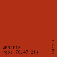 Цвет #B02F15 в цветовой модели RGB обозначается тремя октетами (176, 47, 21) в десятичном формате и #B02F15 в шестнадцатиричном (hex) формате, которые являются интенсивностью красного 176 (hex B0), интенсивность зелёного 47 (hex 2F) и интенсивность синего 21 (hex 15).