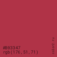 Цвет #B03347 в цветовой модели RGB обозначается тремя октетами (176, 51, 71) в десятичном формате и #B03347 в шестнадцатиричном (hex) формате, которые являются интенсивностью красного 176 (hex B0), интенсивность зелёного 51 (hex 33) и интенсивность синего 71 (hex 47).