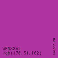 Цвет #B033A2 в цветовой модели RGB обозначается тремя октетами (176, 51, 162) в десятичном формате и #B033A2 в шестнадцатиричном (hex) формате, которые являются интенсивностью красного 176 (hex B0), интенсивность зелёного 51 (hex 33) и интенсивность синего 162 (hex A2).