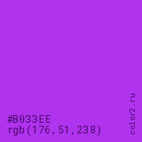 Цвет #B033EE в цветовой модели RGB обозначается тремя октетами (176, 51, 238) в десятичном формате и #B033EE в шестнадцатиричном (hex) формате, которые являются интенсивностью красного 176 (hex B0), интенсивность зелёного 51 (hex 33) и интенсивность синего 238 (hex EE).